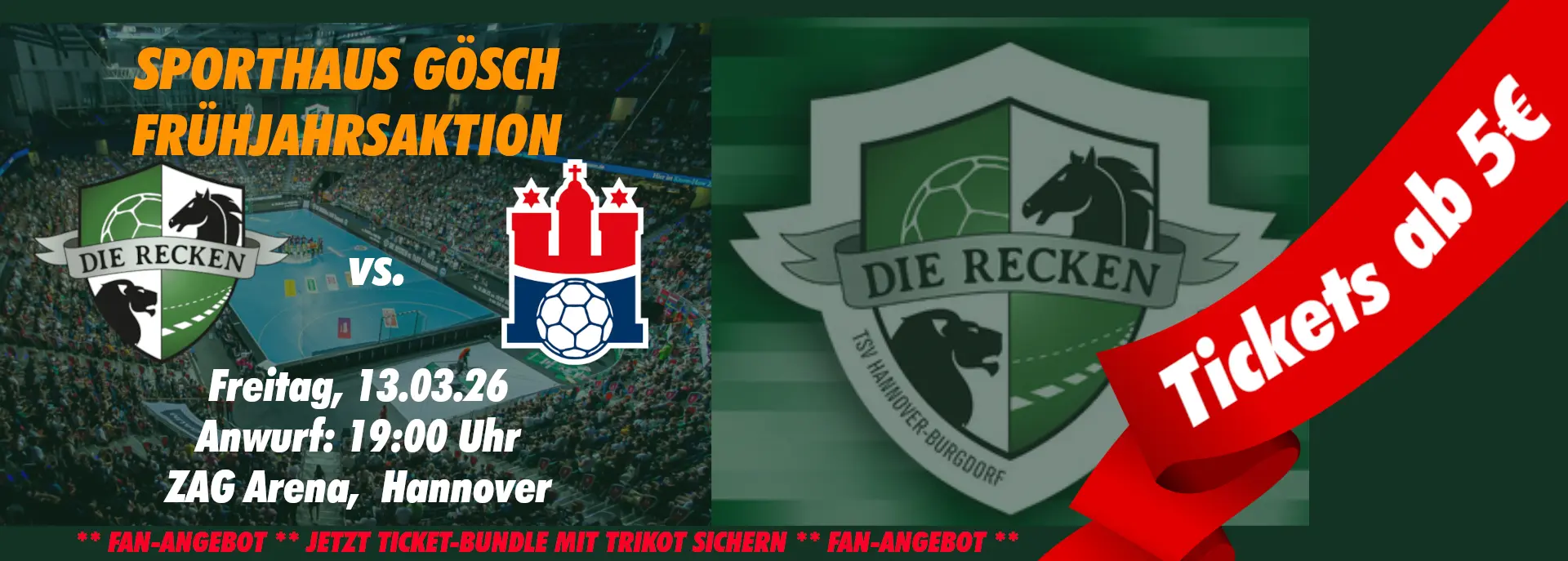 Willkommen im Eventbereich des Sporthaus Gösch – deiner ersten Adresse für exklusive Ticketaktionen für Firmen und Vereine rund um die Handballmannschaft Die Recken. Erlebe Top-Spiele der Bundesliga live in der ZAG Arena Hannover – ob Erwachsenentickets, Kindertickets oder attraktive Kombi-Angebote mit Trikots – hier wirst du fündig!